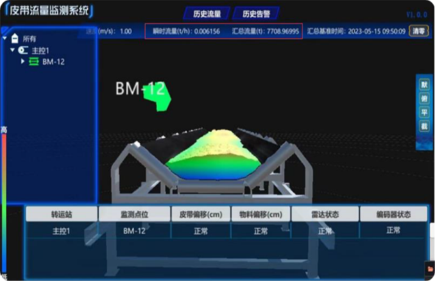 傳送皮帶流量監測系統采用高頻紅外激光雷達掃描及智能算法相結合的技 術方案,實現皮帶運輸流量的實時監測及累計流量監測,皮帶跑偏檢測、報警及 轉運站卡堵預警等功能。